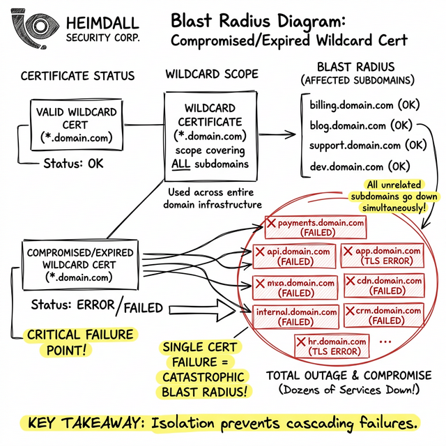 Un seul certificat wildcard (*.yourdomain.com) est très pratique. Avec un seul actif cryptographique, vous pouvez sécuriser votre API, votre environnement de staging, vos tableaux de bord et vos panneaux d'administration internes. Mais en matière de fiabilité des systèmes, la commodité est souvent l'ennemie de la résilience.