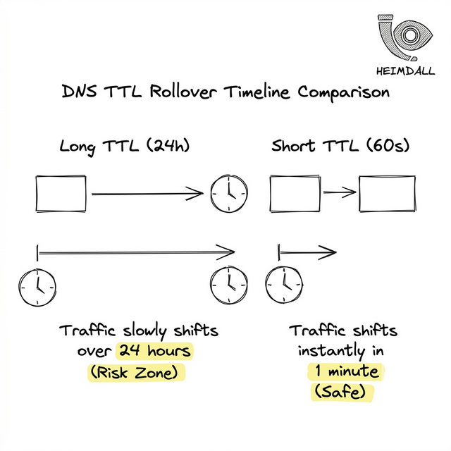 Com o Heimdall Observer, você pode auditar o TTL de seus registros críticos para garantir que eles não foram acidentalmente fixados em um valor alto, prevenindo um lockout catastrófico durante seu próximo incidente.
